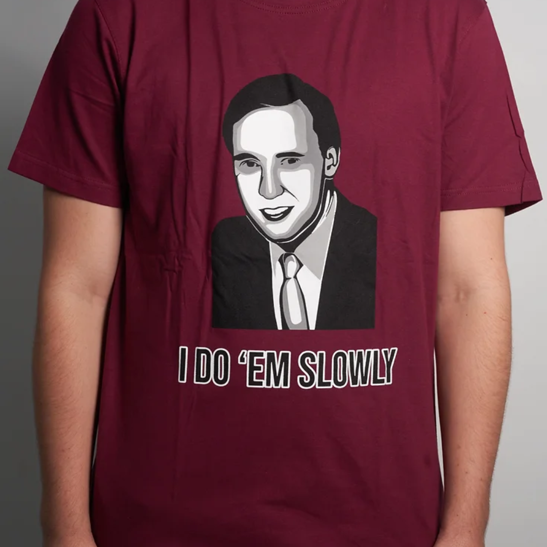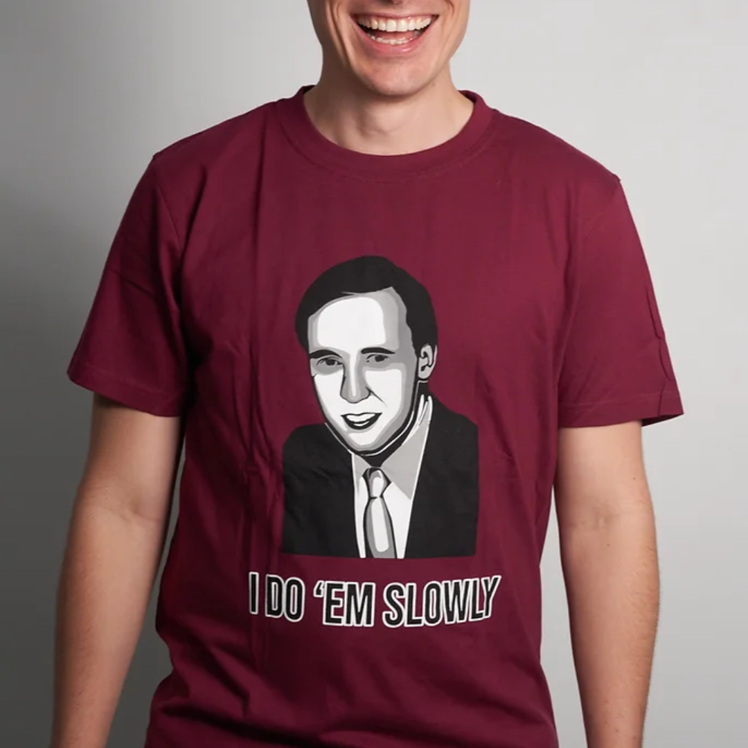 I Do 'Em Slowly T-Shirt – This T-shirt comes in a deep red-burgundy to communicate all kinds of class. The perfect response to "Why won't you call an early election?"